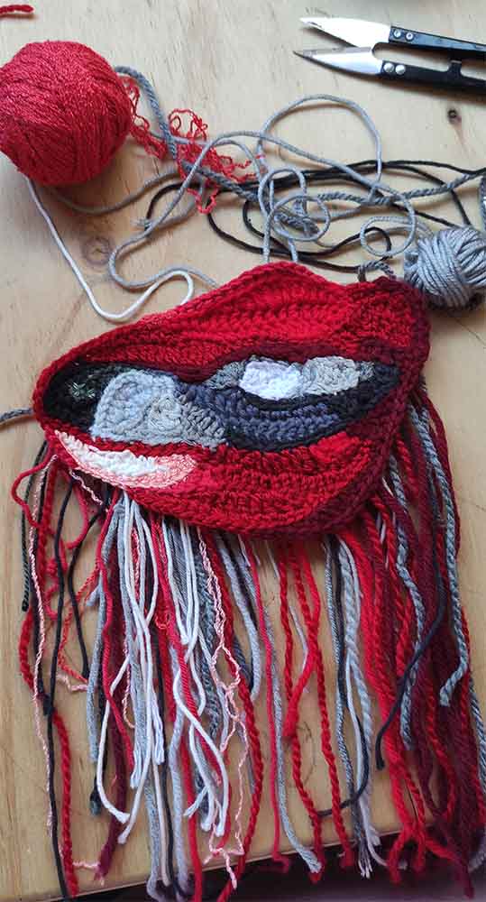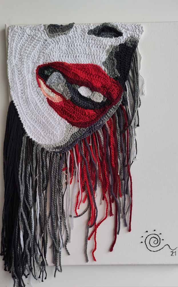 Obra tejida a crochet con técnica “Crochet pictórico” sobre lienzo.