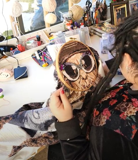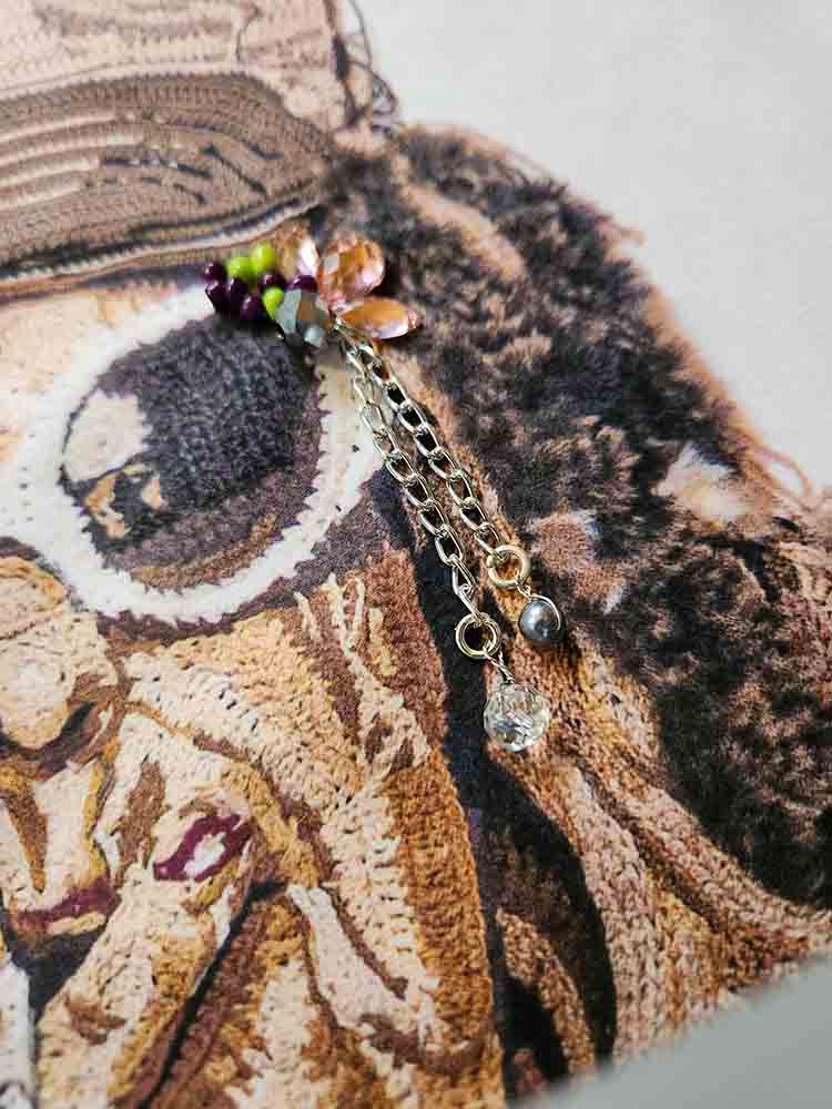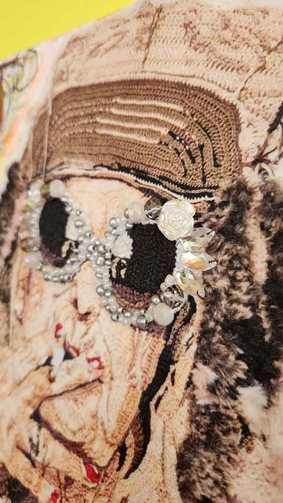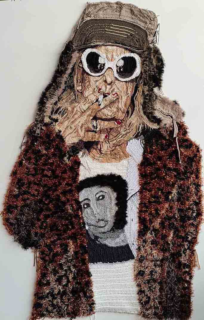 Cecilia eligió representarla usando su técnica de crochet, pero de una manera muy distinta a lo tradicional: aquí el tejido no es suave ni decorativo, sino que está trabajado con texturas fuertes y expresivas. La figura lleva una chaqueta llamativa, gafas grandes y está fumando, transmitiendo esa imagen de “diva” que no tiene miedo a mostrarse tal como es.
